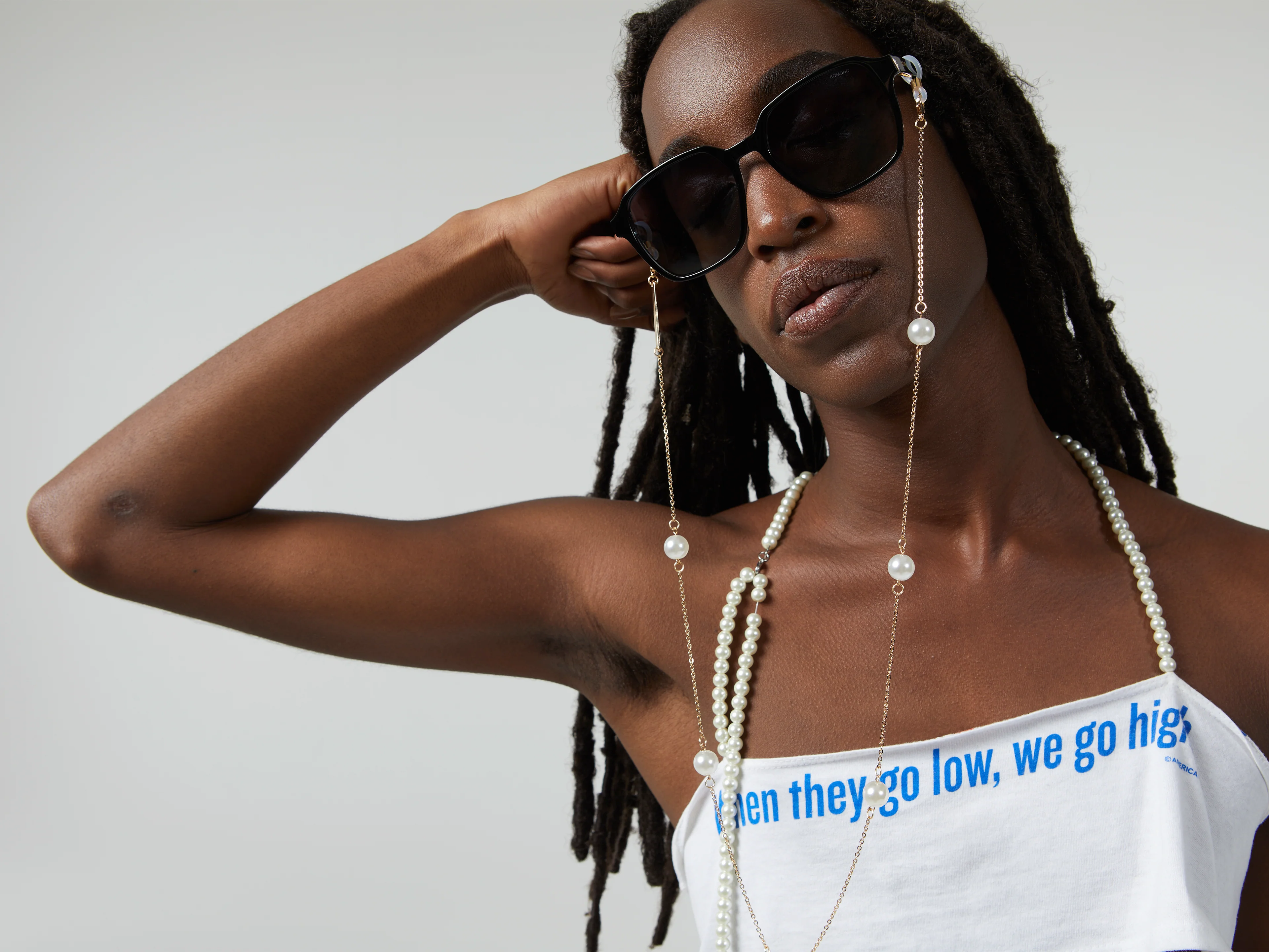 The Rosie is an elegant addition to your sunglasses with its pearls and gold accents. The perfect accessory for that effortless elegant look.